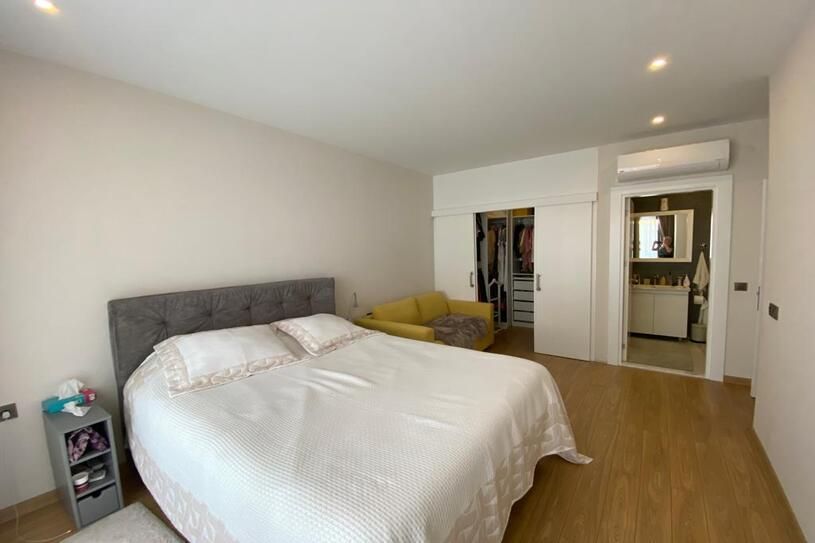 В этом случае собственник планировал и проектировал квартиру с точки зрения практичности и функционала, поэтому планировка квартиры не совсем стандартная. А именно отдельная кухня, что не свойственно квартирам в Турции, также собственник продумал дополнительное место хранения – кладовую, в спальне – вместительную и функциональную гардеробную, а одна из комнат оборудована под кабинет. В квартире 2 спальни одна из них большая с гардеробной и собственным санузлом, вторая детская спальня. Апартаменты очень светлые, просторные с высокими потолками и панорамными окнами в каждой комнате. А виды из этой квартиры, по истине, роскошные. С одной стороны это вид на море и Аланийскую крепость, с другой сторон – на горы, городские пейзажи и местную достопримечательность смотровую площадку с надписью I love Alanya. Эти виды не оставят равнодушными, особенно в вечернее время, когда включаются фонари, подсветки, зажигаются дома, которые находятся ближе к горам и весь город переливается сотнями огней, просто завораживающие виды. Шикарными видами можно полюбоваться с балконов, их, кстати, два с выходами из кухни, зала и спальни, а в кухонной зоне установлена балконная мебель.